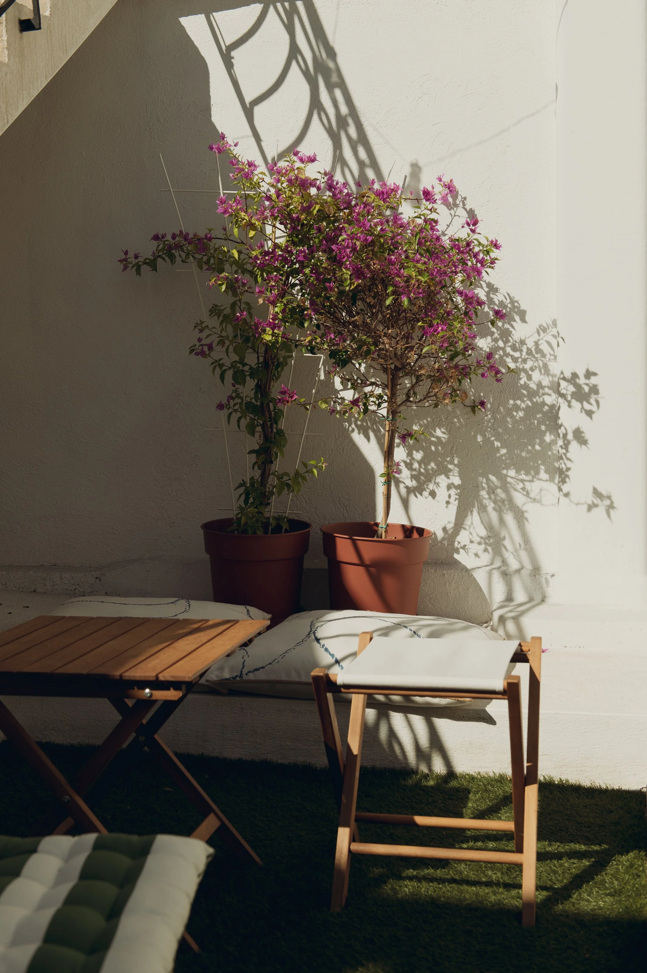 Deux pots de fleurs avec des plantes à fleurs roses, une chaise en bois avec un coussin, une table en bois, et un coussin sur l'herbe, avec des ombres de structures métalliques sur le mur blanc en arrière-plan.